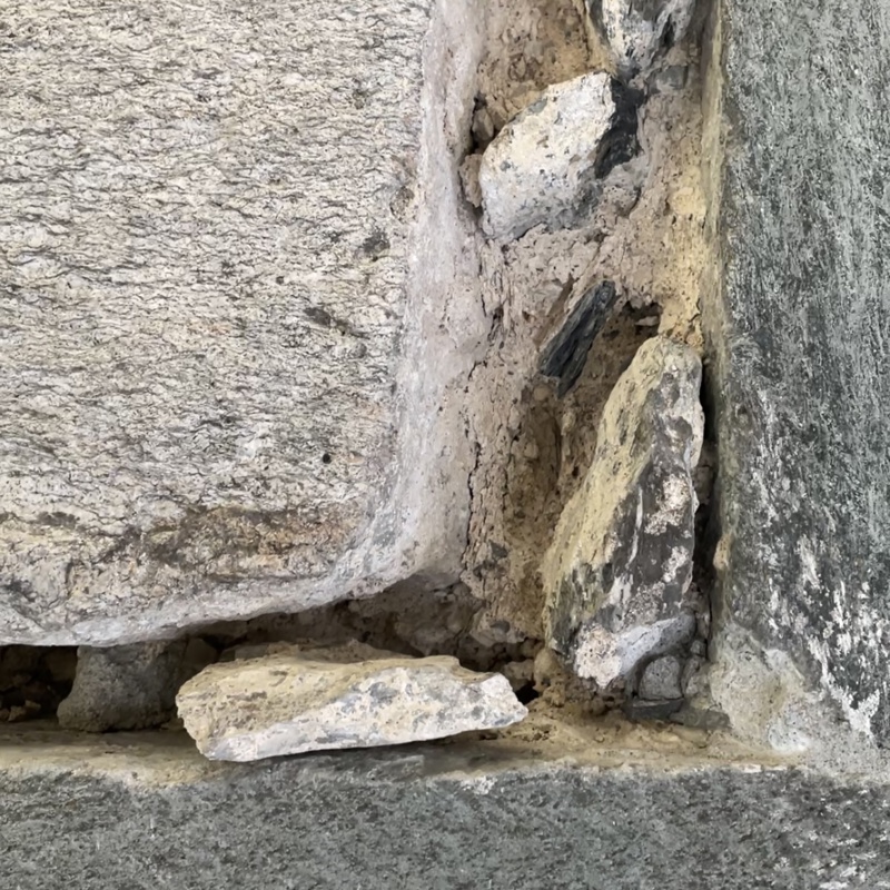 Restautering av utvendige bygningsdeler i kleberstein forsetter gjennom året, og nå starter også de utvendige murarbeidene. Dårlige fuger skal erstattes med nye og bruddsteinsvegger skal slemmes.