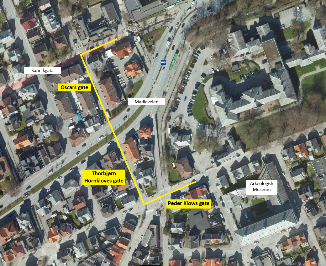 - Det blir anleggsarbeid i Peder Klows gate, Thorbjørn Hornkloves gate og Oscars gate fra våren 2025.