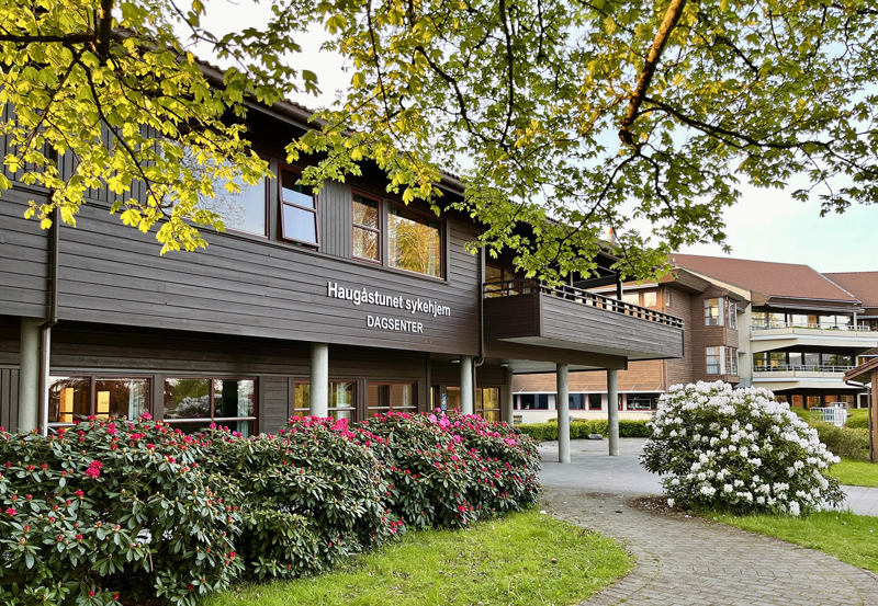 Korttidsavdelingen for mennesker med demens og dagsentret holder til i bygget som er tilsluttet hovedbygget, med inngang fra parkeringsplassen.