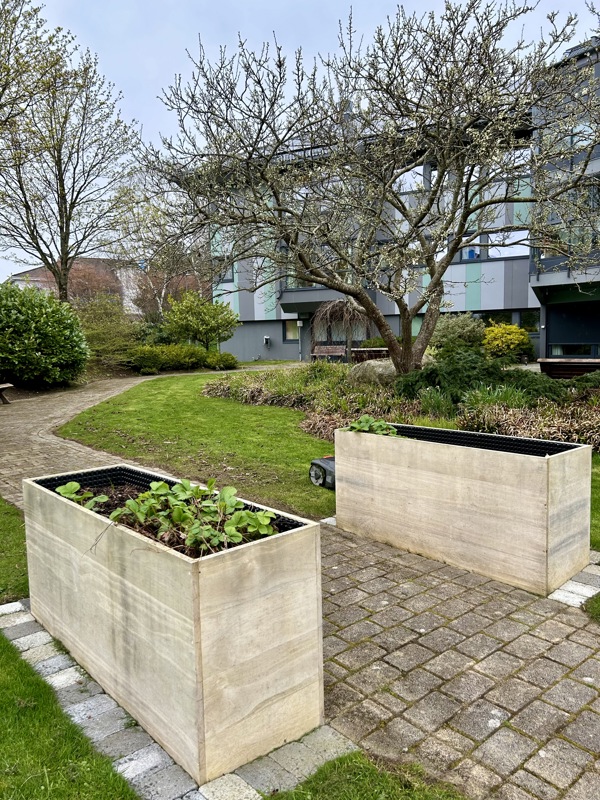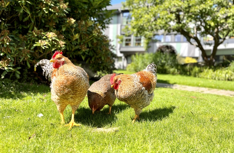 Sykehjemmet har en nydelig hage med jordbær, urter, frukttrær og høner. Årlig klekker de kyllinger i sin rugemaksin, og hønene er gode miljøterapeuter for beboerne. Hønene bor på sykehjemmet i sommermånedene, og når de ikke bor på sykehjemmet er de på ferie på Høle hos en ansatt. Årets eggproduksjon er i gang – og egg hentes daglig inn til måltidene.