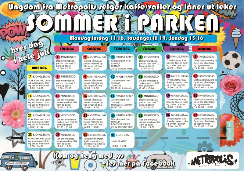 Ingen sommer uten Sommer i parken! Hver dag i juli byr ungdommenes kulturhus Metropolis på aktiviteter, kafé, kaffe, vafler, leker og stylter. Sjekk programmet. Kom og heng med oss!