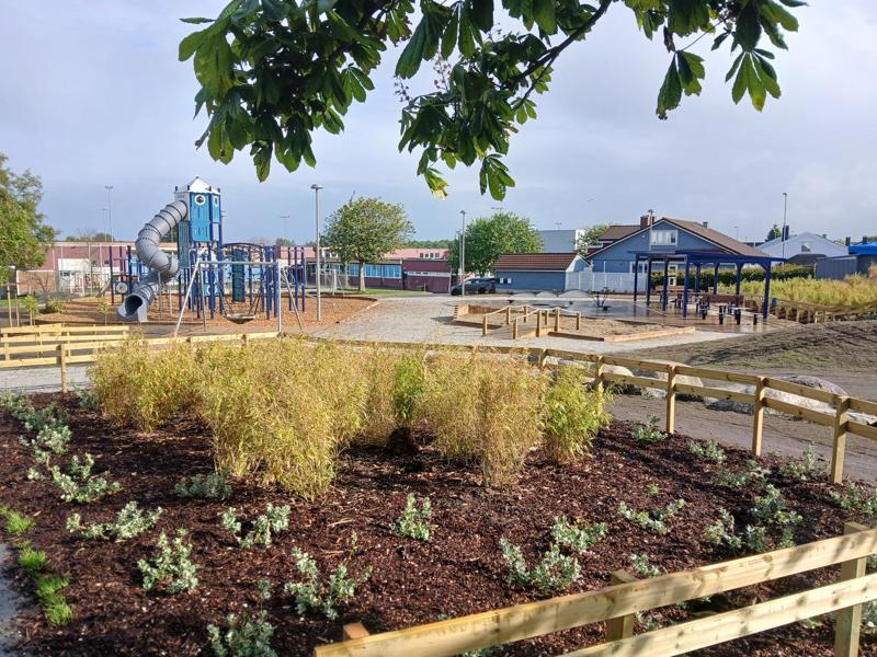 Denne superlekeplassen har utfordrende naturlek som tema og er inspirert av havet i formspråk og fargebruk.