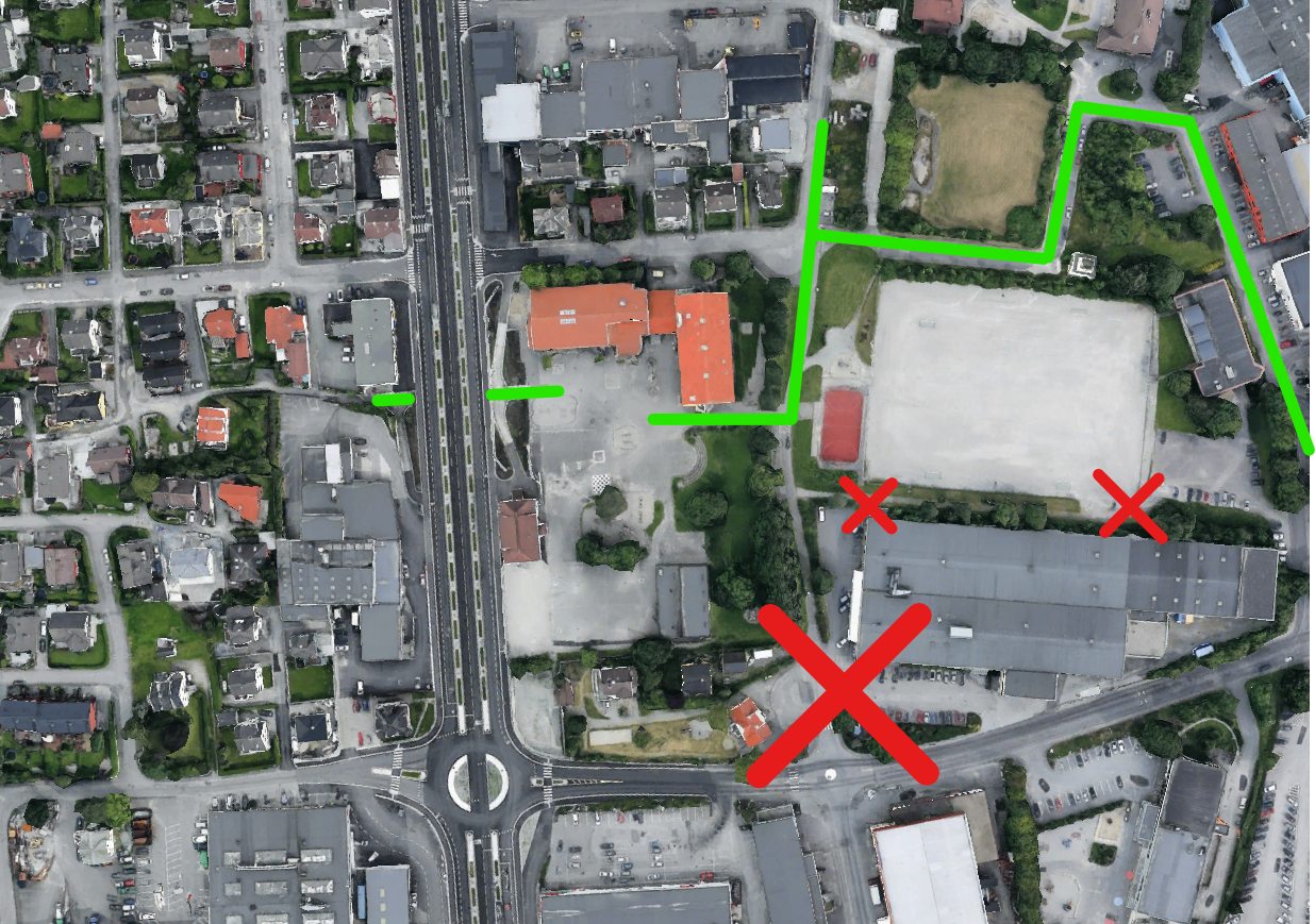 I krysset ved Sandvikveien er det fremdeles mye anleggsarbeid og graving nå. De lager fin undergang som skal øke sikkerheten for skolebarna. Det betyr også stengte veier inn til Kvaleberg skole – se røde kryss på kartet. Inngang til Vinterlys må derfor skje fra parken, på oppsiden av skolen eller via undergangen under Hillevågsveien.