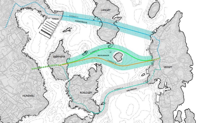 Planprogrammet for eventuell bru til Vassøy omfatter tre alternative bru-traséer.