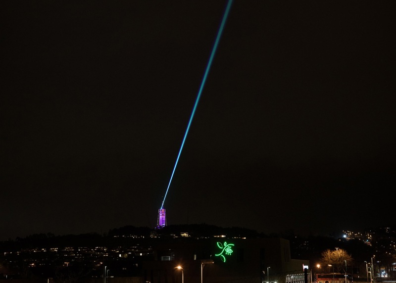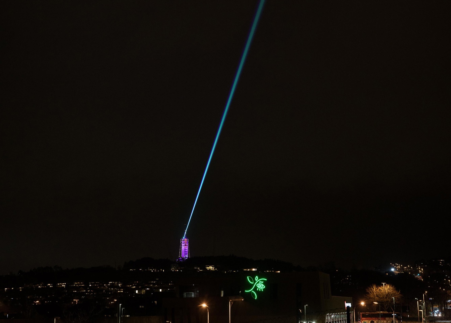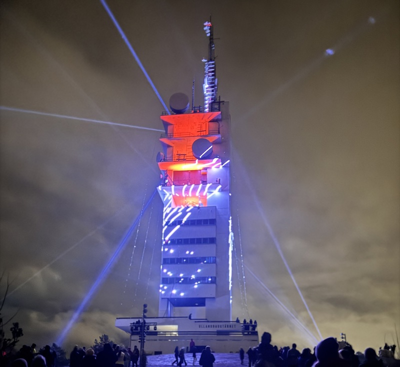I den siste timen ble Ullandhaugtårnet, som hadde lyst ut mot gaver til framtiden hele dagen, forvandlet til et levende, pulserende kunstverk. I et dynamisk samspill med lys, droner, farger, prikker og streker forsvant plutselig den kjente silhuetten – for så å gjenoppstå i en ny form.